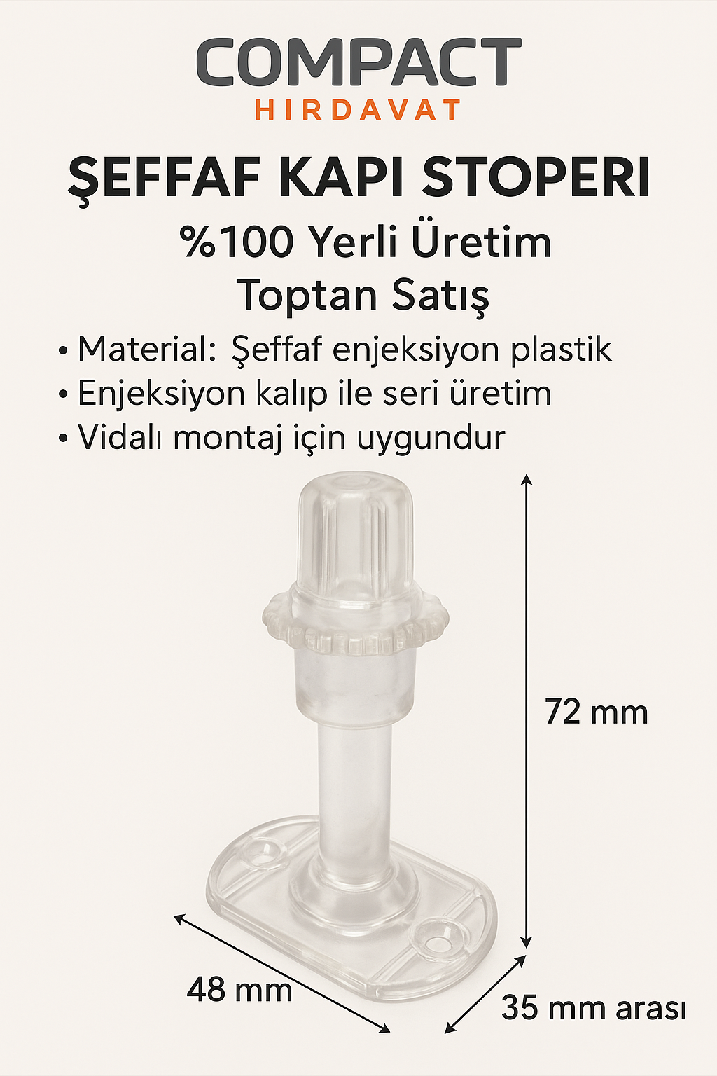 Dayanıklı, modern ve şık tasarımıyla öne çıkan Compact Hırdavat Şeffaf Kapı Stoperi, kapıların duvara çarpmasını önleyerek hem duvarınızı hem de kapınızı korur. Şeffaf yapısı sayesinde her ortama uyum sağlar, estetik görünümünden ödün vermez.